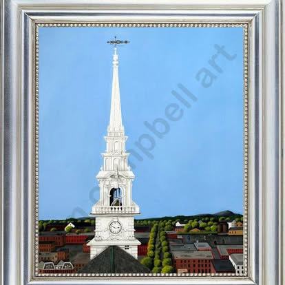 I had a chance to own a Tim Campbell original once—sort of. Tim helped the United Church of Christ at the Head of the Square raise funds to refurbish Keene’s iconic spire on the church. Raffle tickets were sold for $50 or $100 each and I hurriedly bought one, hoping to win. Tim’s rendition of the spire is delightful—the beautifully executed peak standing solo in a blue sky. Off-center in a surprising and refreshing composition, rooted in Keene.